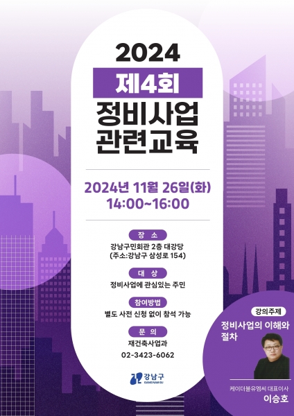 [금요저널] 꿈이 모이는 도시, 미래를 그리는 강남구가 오는 11월 26일 오후 2시부터 4시까지 구민회관 대강당에서 주민 300여명을 대상으로 제4회 재건축 정비사업 아카데미를 개최한다.