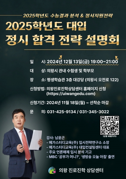 [금요저널] 의왕시는 오는 12월 13일 저녁 7시부터 평생학습관 3층 공연장에서 ‘2025학년도 대입 정시 지원전략 설명회’를 개최한다고 밝혔다.