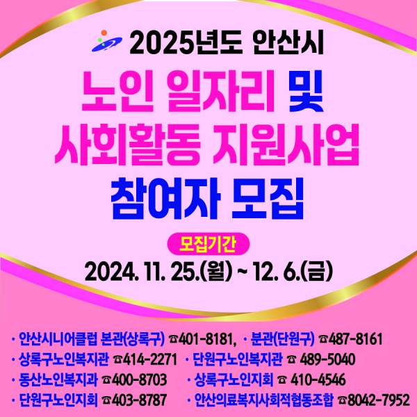 [금요저널] 안산시는 오는 25일부터 다음 달 6일까지 ‘2025년 노인일자리 및 사회활동 지원사업’ 참여자 6천387명을 모집한다고 22일 밝혔다.