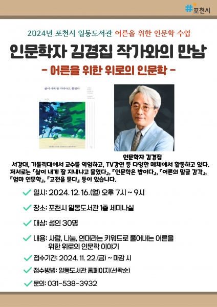 [금요저널] 포천시는 오는 12월 16일 일동도서관에서 성인을 대상으로 인문학자 김경집 작가와의 만남을 진행한다.