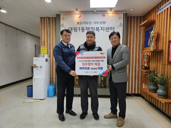 대원1동 행정복지센터에서 열린 협약식에 대원1동 행정복지센터, 대원1동 지역사회보장협의체, 하이치과 3개 기관이 협약에 참석했다.