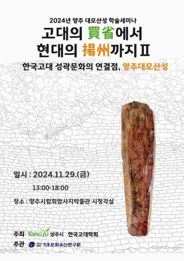 이번 학술 세미나에서는 한국 고대 학회장 백종오 교수의 ‘한국 고대 산성 내 집수 유구의 기능 및 상징, 목간과 권력’ 이라는 주제의 기조강연으로 포문을 열어 △한국 고대의 양주, 교통과 관방 △후삼국의 양주, 신앙과 목간 순으로 주제 발표가 이어질 예정이다.