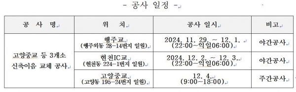 또한 고양중교의 경우에는 야간 공사소음으로 인한 인근 주민들의 불편을 최소화하기 위해 2024년 12월 4일 주간공사를 진행하기로 결정했다.
