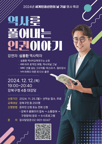 [금요저널] 서울 강북구는 오는 12월 12일 오후 7시, 강북구청 4층 대강당에서 세계인권 선언일의 의미를 널리 알리고 인권 존중 문화를 확산시키고자 ‘인권 특강’을 개최한다고 밝혔다.