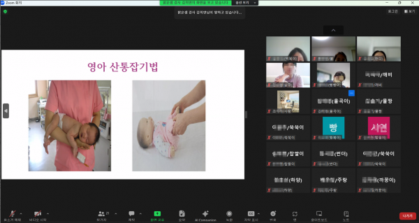 지난 4월, 10월 운영한 출산준비교실에서는 △태교음악 △분만법 △모유수유 성공법 등의 실용적인 교육을 제공했으며 6월, 11월에 운영한 아기 건강교실은 △영아기 건강관리 △아기 마사지 △놀이법 등을 실시간 비대면 강의로 진행했다.