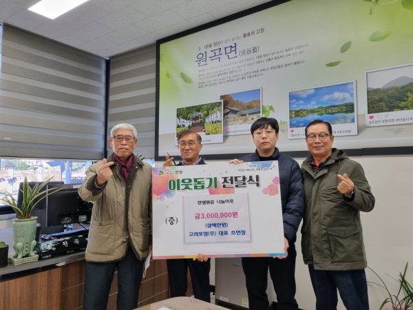 [금요저널] 고려포장 조현창 대표가 11월 22일 원곡면 행정복지센터를 방문해 관내 생활이 어려운 저소득층 가구를 위해 사용해달라며 성금 삼백만원을 원곡면 지역사회보장 협의체에 기탁했다.