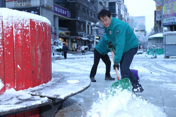 이후 적설량이 많아지자 제설차량이 닿지 않는 이면도로 보행로 육교 등에서 시민불편이 예상되어 출퇴근 시민불편을 최소화 하기 위해 06시부터는 비상근무를 전 부서로 확대 실시해 직원들의 50% 이상을 각 동 현장에 투입했다.