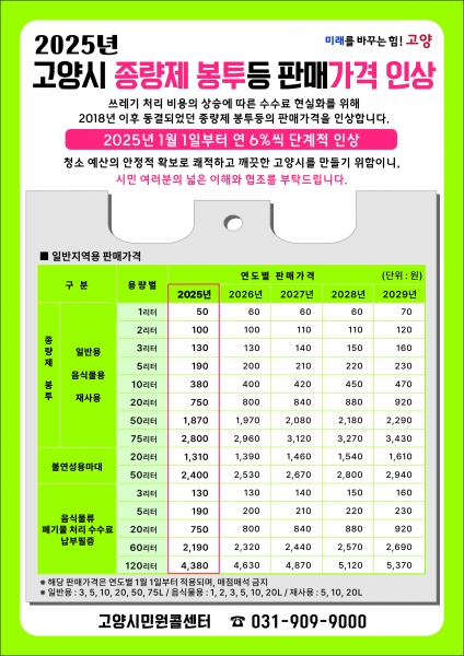 [금요저널] 고양특례시가 2025년 1월 1일부터 종량제 봉투등의 판매가격을 인상한다.