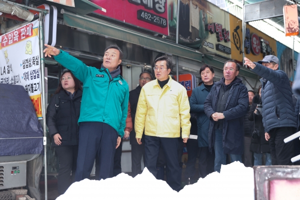 [금요저널] 김성제 의왕시장이 28일 폭설로 천장 그늘막이 무너진 의왕도깨비시장을 찾아 현장 점검과 피해 복구 작업에 나섰다.