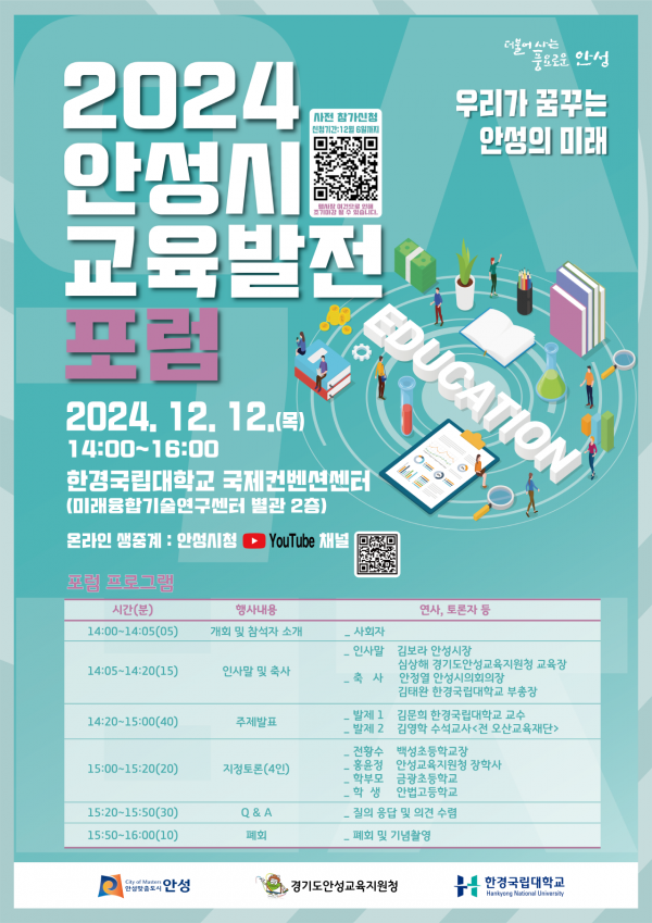 [금요저널] 안성시는 오는 12월 12일 한경국립대학교 국제컨벤션센터에서 ‘안성시 교육발전 포럼’을 개최한다고 밝혔다.