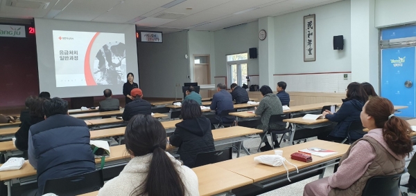 이날 △응급처치의 필요성과 응급상황 시 행동 요령, △심폐소생술과 자동심장충격기 실습, △상황별 응급처치 등 전문 강사에게 교육받음으로써 위급한 상황에서 신속·정확하게 대처할 수 있는 능력을 배양하는 시간을 가졌다.