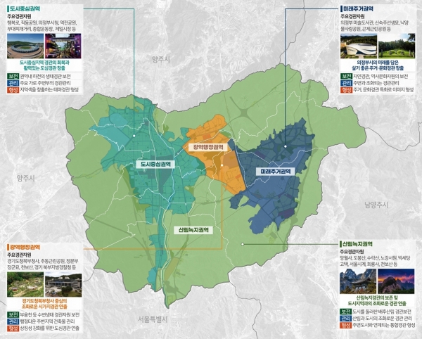 이번에 수립한 2030 의정부시 경관계획은 지난 경관계획의 타당성 검토와 도시경관 변화 등을 반영, ‘자연과 도시속의 의정부, 다채로움을 느끼다’라는 경관미래상으로 설정했다.