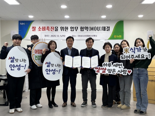 이날 업무협약은 안성쌀 소비촉진을 위해 마련됐으며 협약서에는 아침밥먹기 캠페인 참여, 지역쌀 소비 확대, 양기관 협력강화 등의 내용이 담겼다.