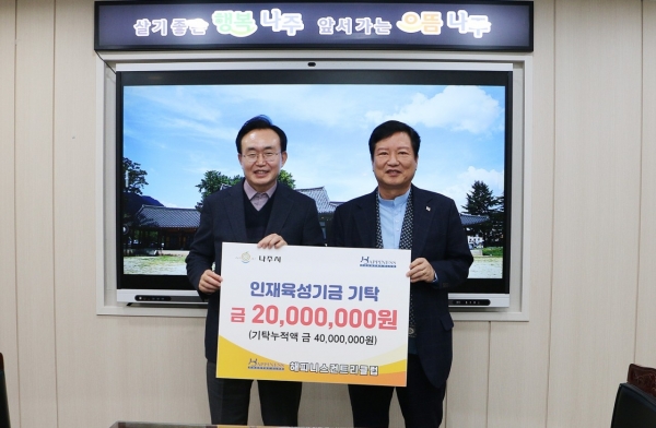 [금요저널] 전라남도 나주시는 다도면에 위치한 해피니스컨트리클럽 양진석 회장이 5일 지역인재육성기금 2천만원을 나주교육진흥재단에 기탁했다고 밝혔다.