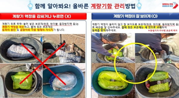 수도계량기 동파 대비 요령으로는 △수도계량기 보호통 내부 보온재 채우기 △옥외화장실 및 외부 수도배관 보온재로 감싸기 △장기간 외출 시 수도꼭지 조금 틀어놓기 △수도계량기가 얼었을 경우 미지근한 물 또는 헤어드라이기로 천천히 녹이기 등이 있다.