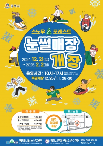 [금요저널] 평택시청소년재단 평택시무봉산청소년수련원은 오는 21일부터 내년 2월 2일까지 야외 눈썰매장을 운영한다고 밝혔다.