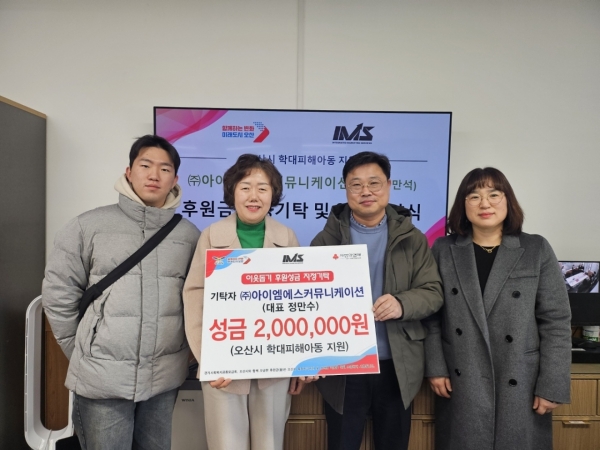 [금요저널] 오산시는 ㈜아이엠에스커뮤니케이션에서 지난 9일 관내 학대피해아동 지원을 위해 오산시청에서 이웃돕기 성금 200만원 후원금 기탁식 및 업무협약을 체결했다고 밝혔다.