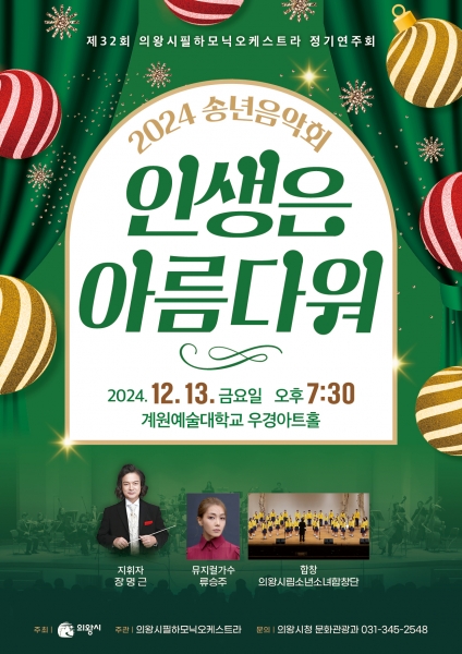 장명근 지휘자가 이끄는 이번 연주회는 2024년을 마무리하는 송년음악회로 ‘인생은 아름다워’라는 주제로 클래식 음악과 캐럴 등 다양한 장르의 음악을 선보여 시민들에게 즐거움과 감동을 선사할 예정이다.