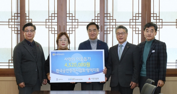 이날 참석한 한국공인중개사협회 이현애 평택지회장은 “어려운 경제 상황에서 도움이 필요한 이웃에게 보탬이 되고자 성금을 기부하게 됐다”며 “앞으로도 어려운 취약계층을 위해 다양한 노력을 하겠다”고 전했다.