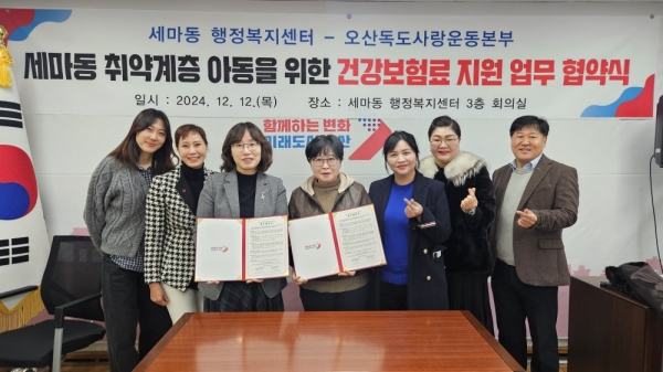 [금요저널] 오산시 세마동은 지난 12일 오산독도사랑운동본부와 세마동 취약계층 아동의 건강보험료 지원을 위한 업무 협약을 맺었다.