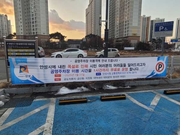 [금요저널] 안성시는 폭설로 인한 특별재난지역 선포에 따라 시민들의 경제적 부담을 덜고 지역사회의 빠른 회복을 지원하기 위해 관내 공영주차장 7개소를 최초 1시간 무료로 이용할 수 있도록 운영한다고 23일 밝혔다.