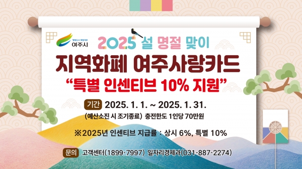 [금요저널] 여주시는 2025년 1월 설 명절을 맞이해 지역화폐 ‘여주사랑카드’ 인센티브를 상시 인센티브 6%에서 특별 인센티브 10%로 확대 지원한다고 밝혔다.