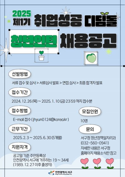 [금요저널] 인천 서구는 관내 미취업 청년의 공공기관에서 일 경험 기회 제공 및 취업역량 강화를 위한 ‘2025년 제1기 취업성공 디딤돌 청년인턴사업’을 추진한다고 밝혔다.