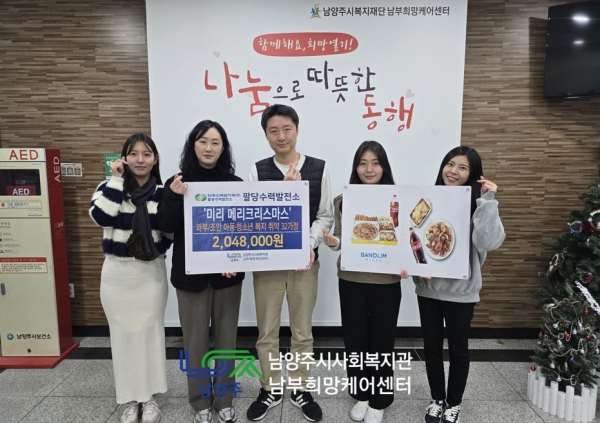 이번 지원은 ‘미리 메리크리스마스’ 사업의 하나로 ㈜팔당수력발전소는 와부·조안 지역 복지 취약 32가구의 아동·청소년을 위한 피자와 치킨 기프티콘을 남부희망케어센터에 전달했다.