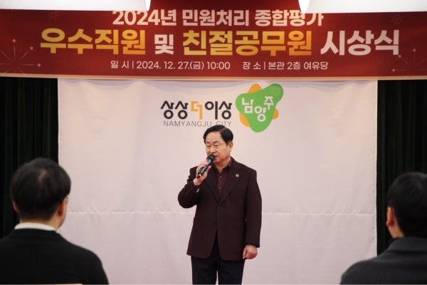 [금요저널] 남양주시는 27일 시청 여유당에서 ‘2024년 민원 처리 종합평가 우수자 및 친절공무원’ 으로 선정된 직원 24명에게 표창장과 부상을 수여하고 한 해의 노고를 격려했다.