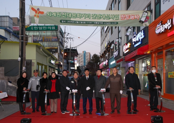 이어 개선된 간판을 배경으로 거리 점등 퍼포먼스가 진행되며 화사한 불빛과 함께 퇴계원의 새로운 야경이 연출됐다.