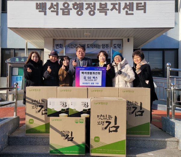 백승호 백석읍장은 "매년 지역사회를 위해 봉사해 주시는 백석생활개선회에 진심으로 감사드린다"며 "기부해 주신 김은 도움이 필요한 가정에 잘 전달하겠다"고 밝혔다.