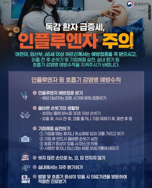[금요저널] 화성특례시는 최근 인플루엔자 유행이 2016년 이래 최고 수준으로 발생함에 따라 면역력이 약한 고위험군의 예방접종과 호흡기 감염병 예방수칙 준수를 당부했다.
