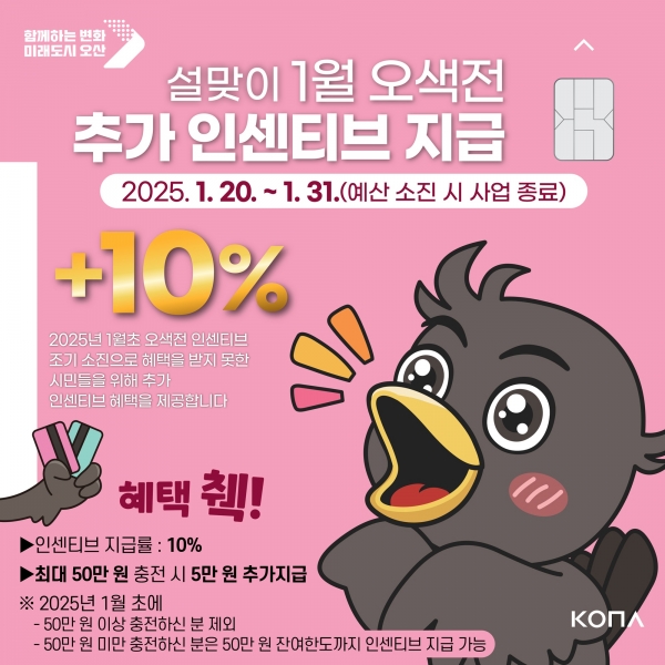 [금요저널] 오산시는 설 명절을 맞아 지역경제를 활성화하고 시민들의 가계 부담을 덜기 위해 오색전 추가 인센티브 이벤트를 진행한다고 14일 밝혔다.