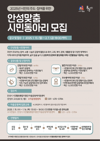 [금요저널] 안성시 시민활동통합지원단 마을공동체지원센터는 지난13일에 ‘2025년 주민주도·참여를 위한, 안성맞춤 시민동아리 지원 공모사업’을 공고했다.