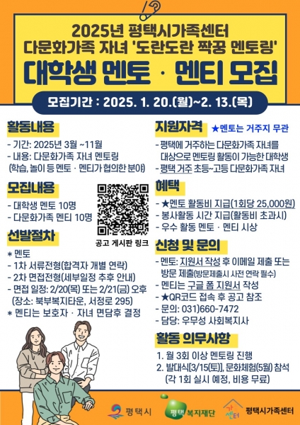 [금요저널] 평택시가족센터는 1월 20일부터 2월 13일까지 다문화가족 자녀 대상 ‘도란도란 짝꿍 멘토링’에 참여할 대학생 멘토와 멘티를 모집한다.