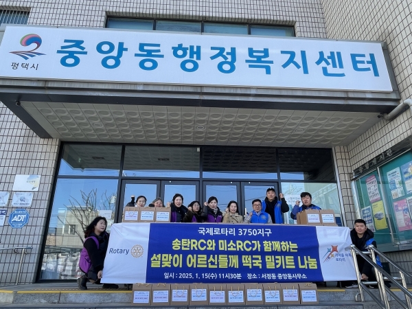 [금요저널] 송탄로타리클럽과 송탄미소로타리클럽은 지난 15일 평택시 중앙동 행정복지센터에서 취약계층 이웃을 위한 ‘설맞이 떡국 밀키트 나눔 연합 행사’를 열었다.
