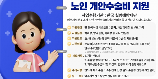 [금요저널] 여주시보건소 건강증진과에서는 2025년 노인 안 의료비 지원을 위해 한국실명예방재단과 함께 백내장 등 시력상실이 우려되는 취약계층 노인들의 개안수술비를 지원하고 있다.