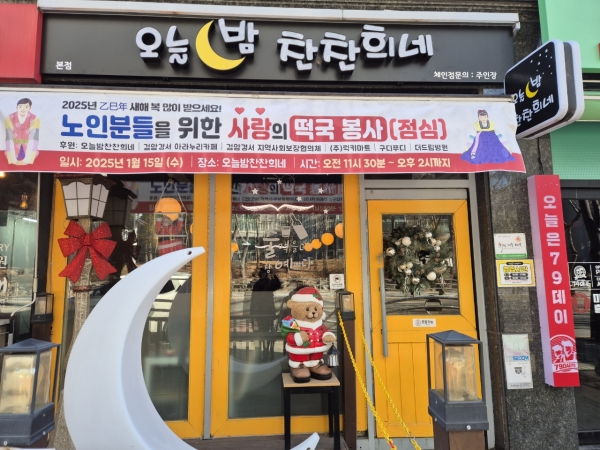 [금요저널] 인천광역시 서구 검암동에 위치한 오늘밤 찬찬희네, 검암경서 아라누리는 지난 15일에 검암서해그랑블아파트 외 7곳 80여명의 경로당 어르신들을 모시고 설날맞이 떡국나눔 행사를 개최했다.