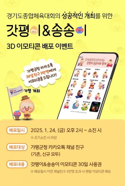 이모티콘은 24일 오후 2시에 ‘가평군청’ 카톡 채널 친구 3만명에게 무료로 배포되며 사용기간은 다운로드로부터 30일이다.