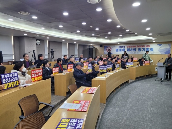[금요저널] 수원전투비행장 화성이전반대 범시민대책위원회’는 22일 모두누림센터 2층 세미나실에서 2025년 정기총회를 개최했다 이날 총회에는 이홍근 경기도의원, 송옥주 국회의원을 대신해 백승재 보좌관, 배정수 화성시의회 의장, 시의회 수원군공항 화성이전반대 특별위원회 정흥범·김영수 공동위원장, 범대위 회원 60여명이 참석한 가운데 2024년도 범대위 회계 결산 및 결산안 승인·주요성과 보고와 2025년 추진계획 등을 발표했다.