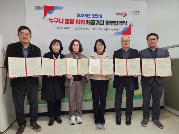 [금요저널] 오산시는 22일 오산시청에서 2025년‘누구나 돌봄’ 사업추진을 위해 5개 서비스 제공기관과 업무협약을 체결했다누구나 돌봄은 거동이 불편해 혼자서는 일상생활이 어렵거나 돌봐줄 가족이 없는 경우, 공적 돌봄서비스를 이용하지 않거나 서비스 이용 중 불가피한 공백이 발생하는 경우 등의 돌봄 공백을 메워 모든 시민에게 신속한 돌봄서비스를 제공하기 위한 사업이다.