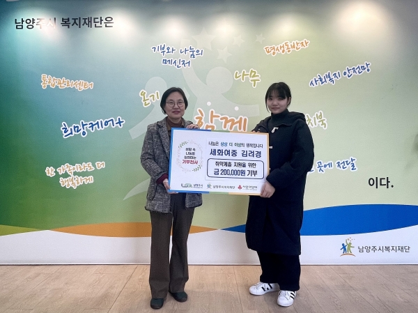 [금요저널] 세화여자중학교 3학년 김려경 학생은 지난 24일 ‘제2회 미래청소년 과학오디션’에서 우수상을 수상하며 받은 상금 20만원 전액을 남양주시복지재단에 기부했다.