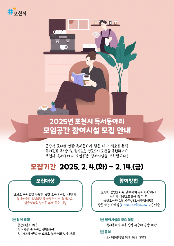 [금요저널] 포천시가 오는 14일까지 ‘2025년 독서동아리 모임공간 지원 사업’에 참여할 시설을 모집한다.