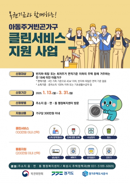 [금요저널] 화성특례시가 오는 3월 31일까지 열악한 주거 환경에 거주하는 아동의 주거환경 및 위생 개선을 위한 ‘아동주거빈곤가구 클린서비스 지원 사업’ 대상자를 모집한다.