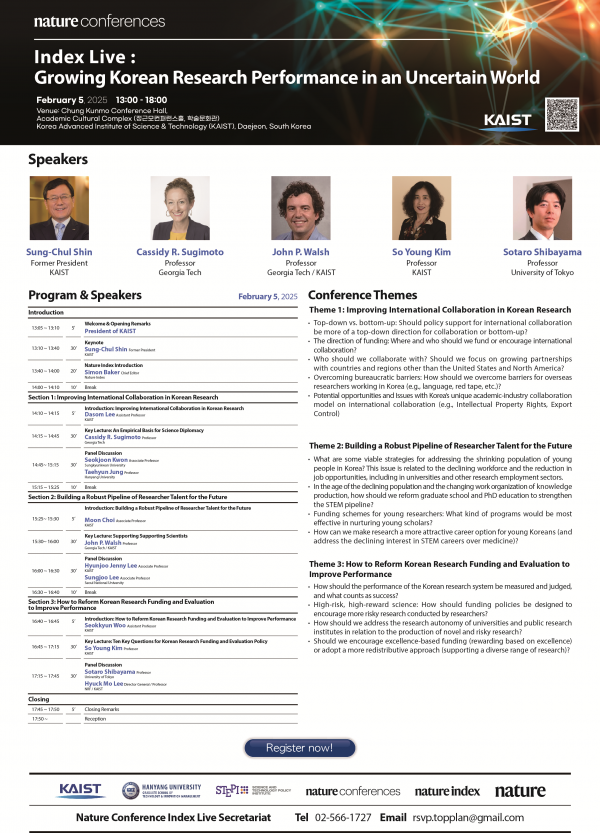 2.5. 인덱스 라이브는 한국과학기술원 과학기술정책대학원과 네이처 인덱스 주관의 행사이며 ‘불확실한 세계에서 성장하는 한국의 연구 성과’를 주제로 국내외 과학기술 정책 전문가, 과학자 및 공학자가 한자리에 모여 한국 과학기술 생태계가 직면한 도전 과제와 잠재적 기회에 대해 심도 있게 논의할 예정이다.