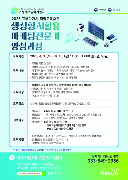 [금요저널] 양주시가 오는 3월 4일부터 20일까지 ‘양주여성새로일하기센터’에서 직업교육훈련 '생성형 AI 활용 마케팅전문가 양성 과정' 교육생을 모집한다고 밝혔다.