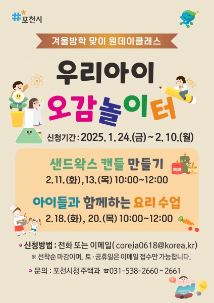 우리아이, 오감놀이터는 겨울방학을 맞은 아동을 대상으로 △샌드왁스 캔들 만들기 △아이들과 함께하는 요리 수업 등 다양한 체험 활동을 제공해 지역의 문화복지 환경을 개선하고 지역 활력을 도모하는 프로그램이다.
