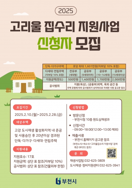 [금요저널] 부천시는 2월 10일부터 2월 28일까지 ‘고리울 집수리 지원사업’ 신청자를 모집한다.