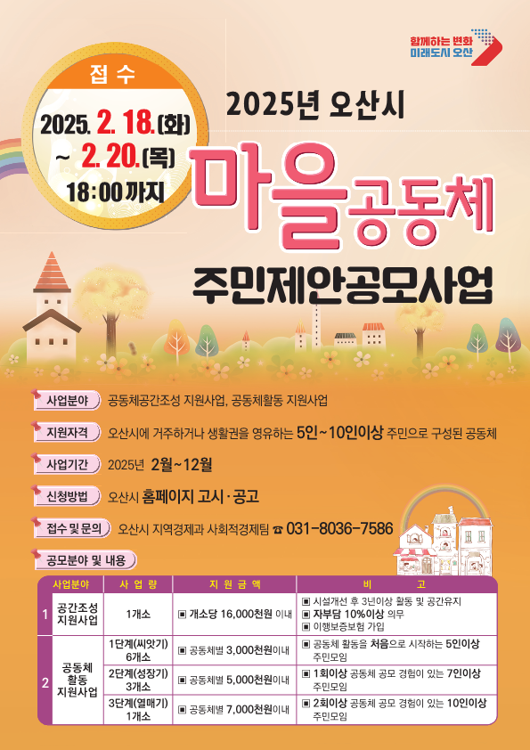 [금요저널] 오산시는 ‘2025년 오산시 마을공동체 주민제안 공모사업’ 신청자를 이달 18일부터 20일까지 모집한다.