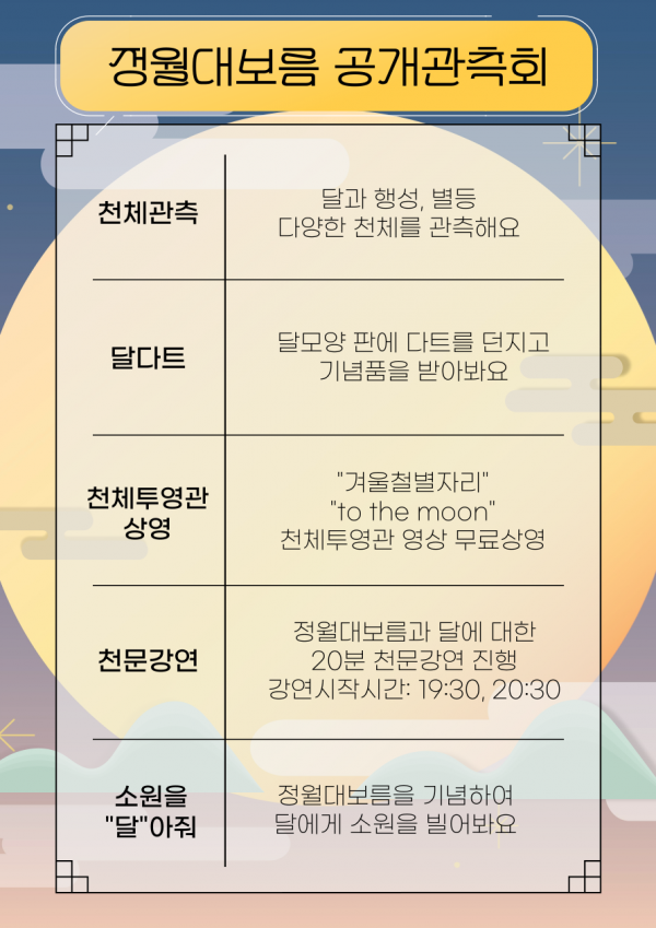 이와 함께 정월대보름의 의미와 달에 대해 알아보는 천문강연, 과학을 놀이로 체험하는 달 다트 게임, 소원 종이 등 다양한 이벤트가 마련된다.